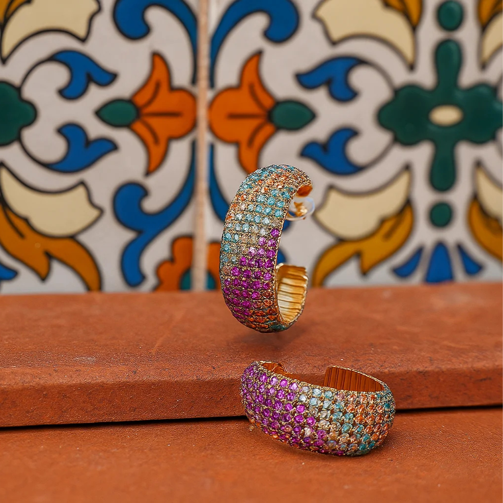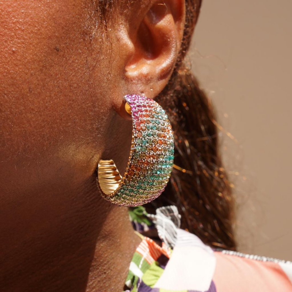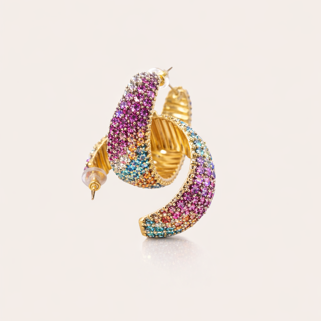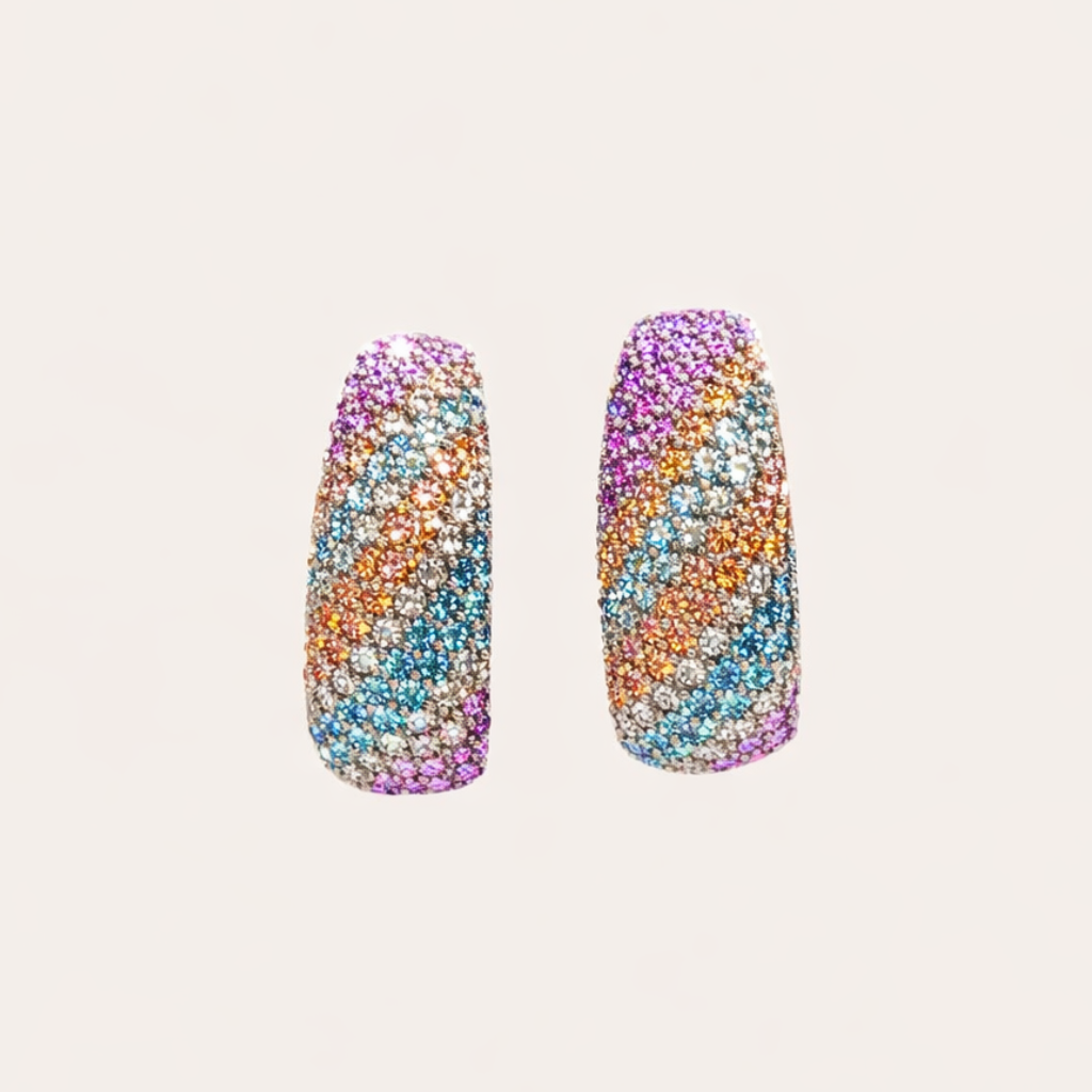 Deze oorbellen zijn bedekt met meerkleurige kristallen en hebben een zachte pastelglans. Perfect voor de zomer.