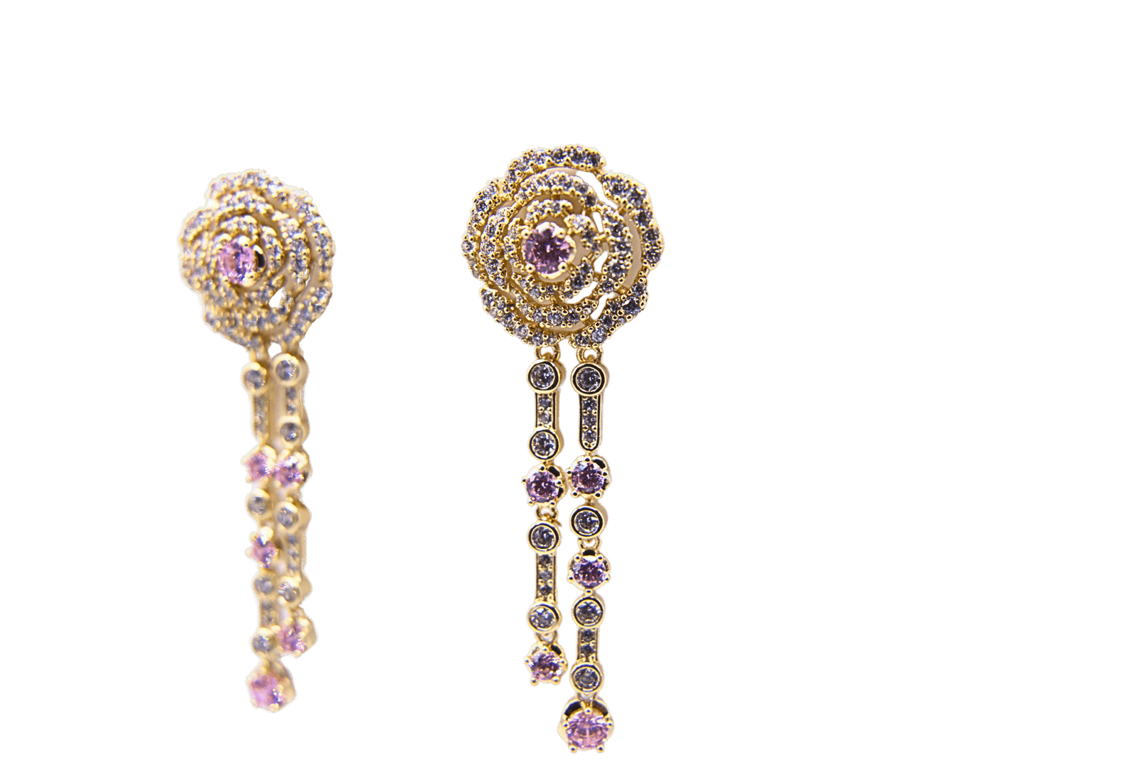 Echte romantische camelia oorbellen. Deze oorbellen bevatten een Camelia bloem versierd met sprankelende gouden en roze kristallen. Deze oorbellen bewegen mee. Deze oorbellen zijn geschikt voor bruiloften, galas of elke chique gelegenheid.