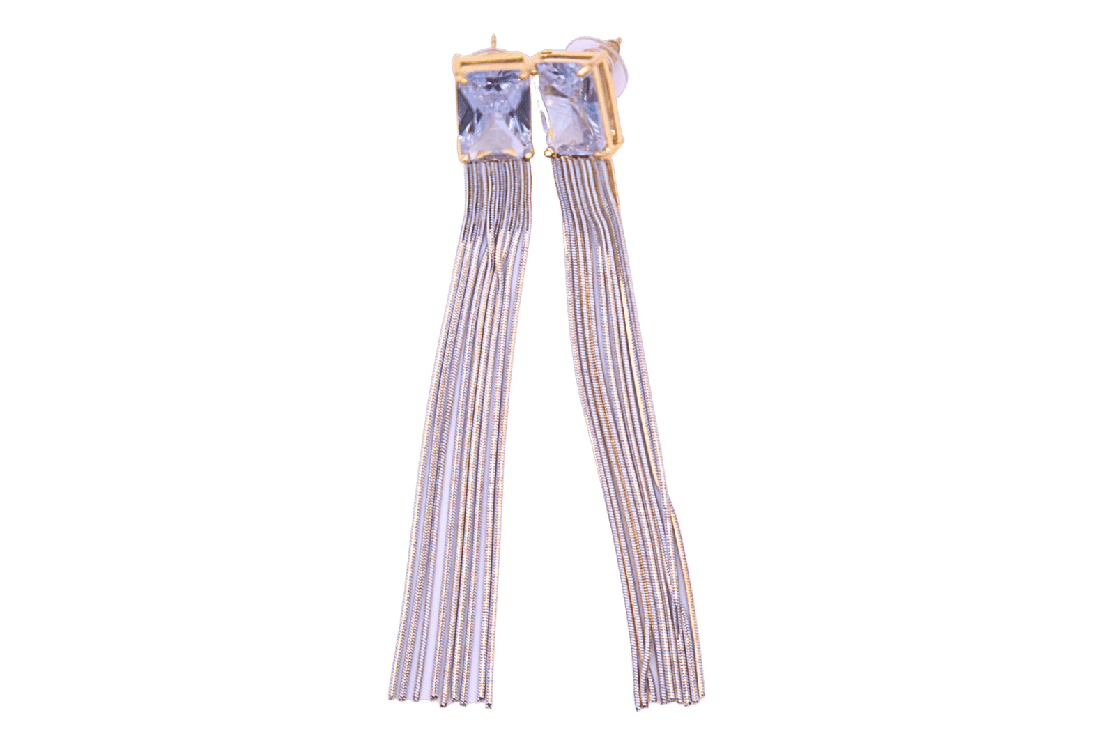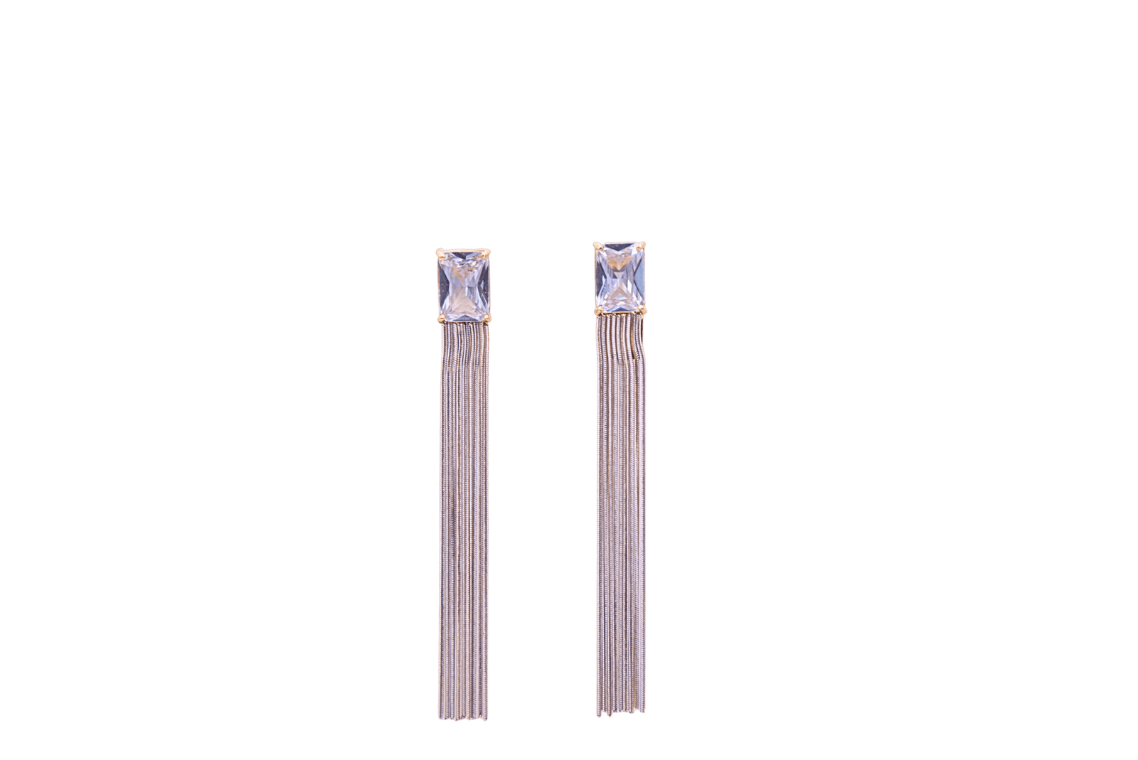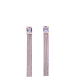 Deze lange oorbellen bevatten een delicate vierkante lichtroze steen met zilveren franjes die elegant meebewegen.