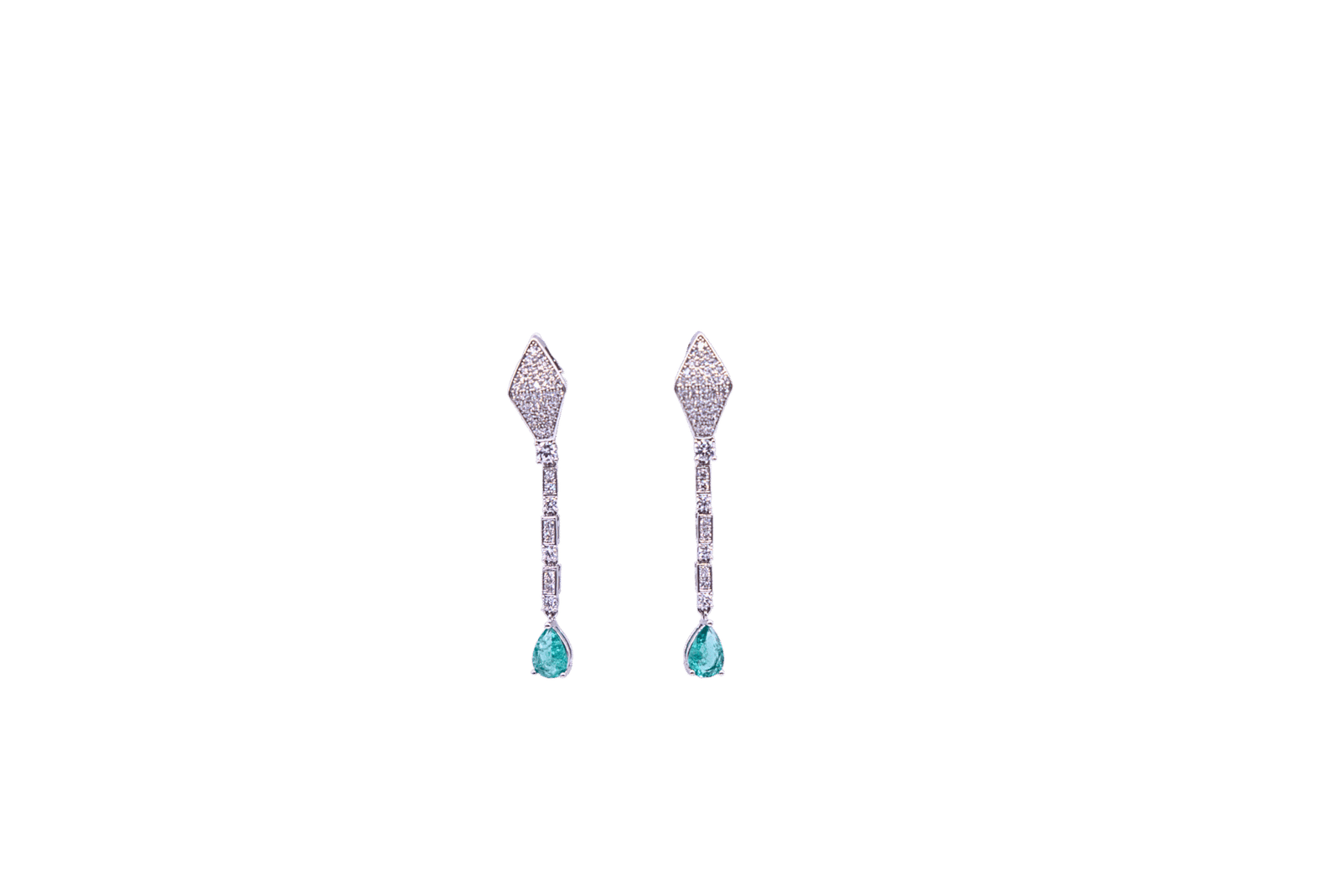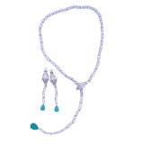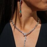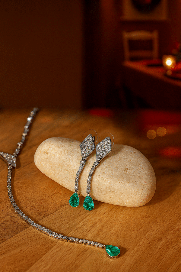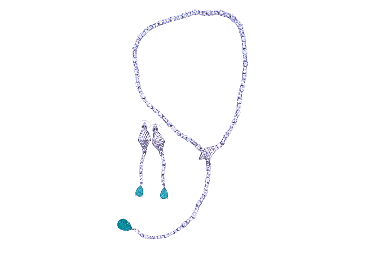 Deze zilverkleurige set schittert met ontelbare heldere kristallen, die elke glinstering van licht vangen. Een sereen groen kristal aan de onderkant voegt een opvallend detail toe: een traantje van geluk, voor een vleugje drama.