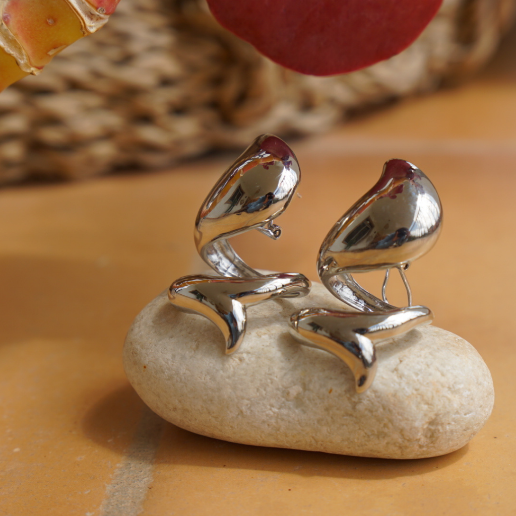 Bold and modern statement earrings with a sculptural design, available in gold and silver finishes.
